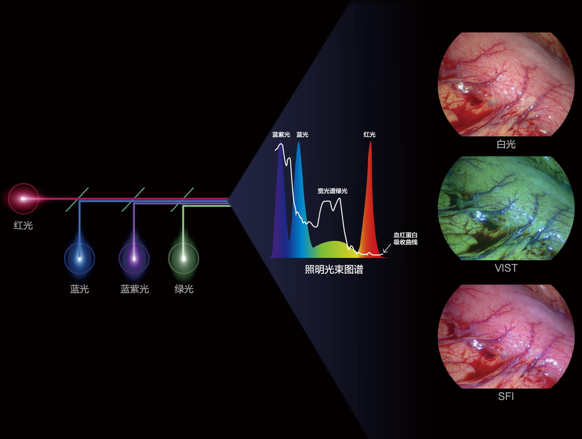 采用红光、蓝光、蓝紫光和绿光四色LED照明,实现更高的光谱自由度, 助力更好的色彩还原 SFI:快速定位异常血运 VIST:区分中浅层微血管,避免损伤